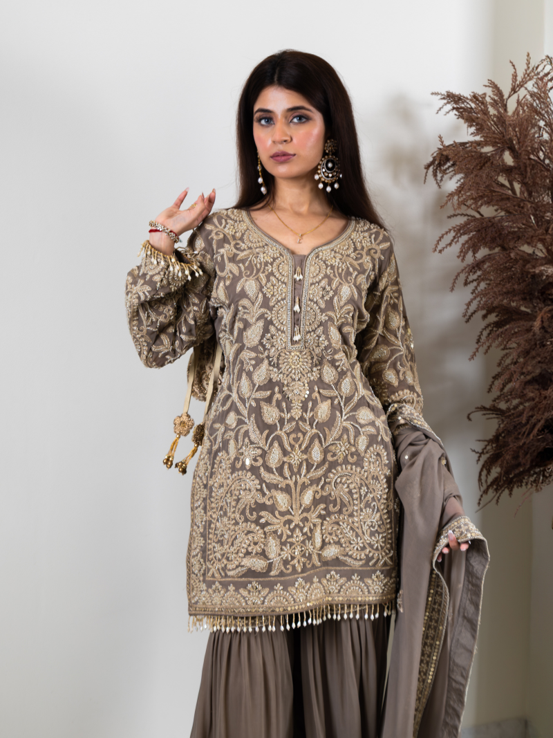 Saher Pure Georgette Handworked Garara Set – Taupe Beige