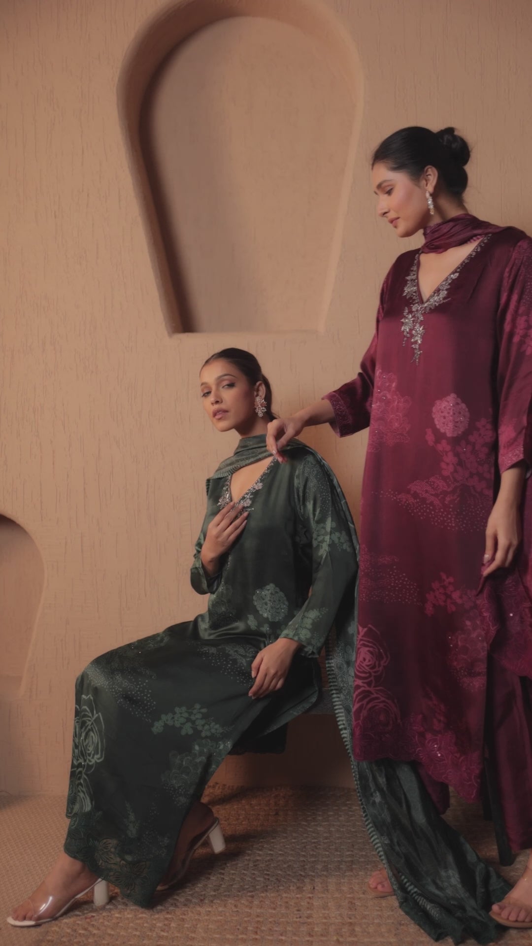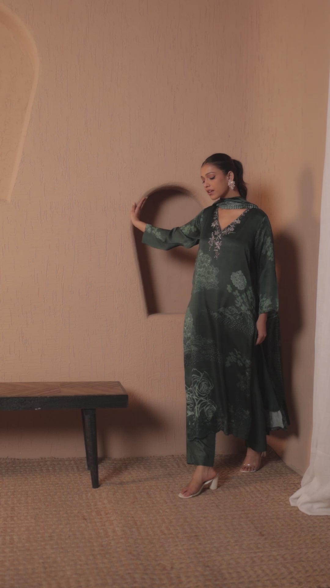 Afreen Satin Printed Kurta Set with Dupatta- Emerald Green