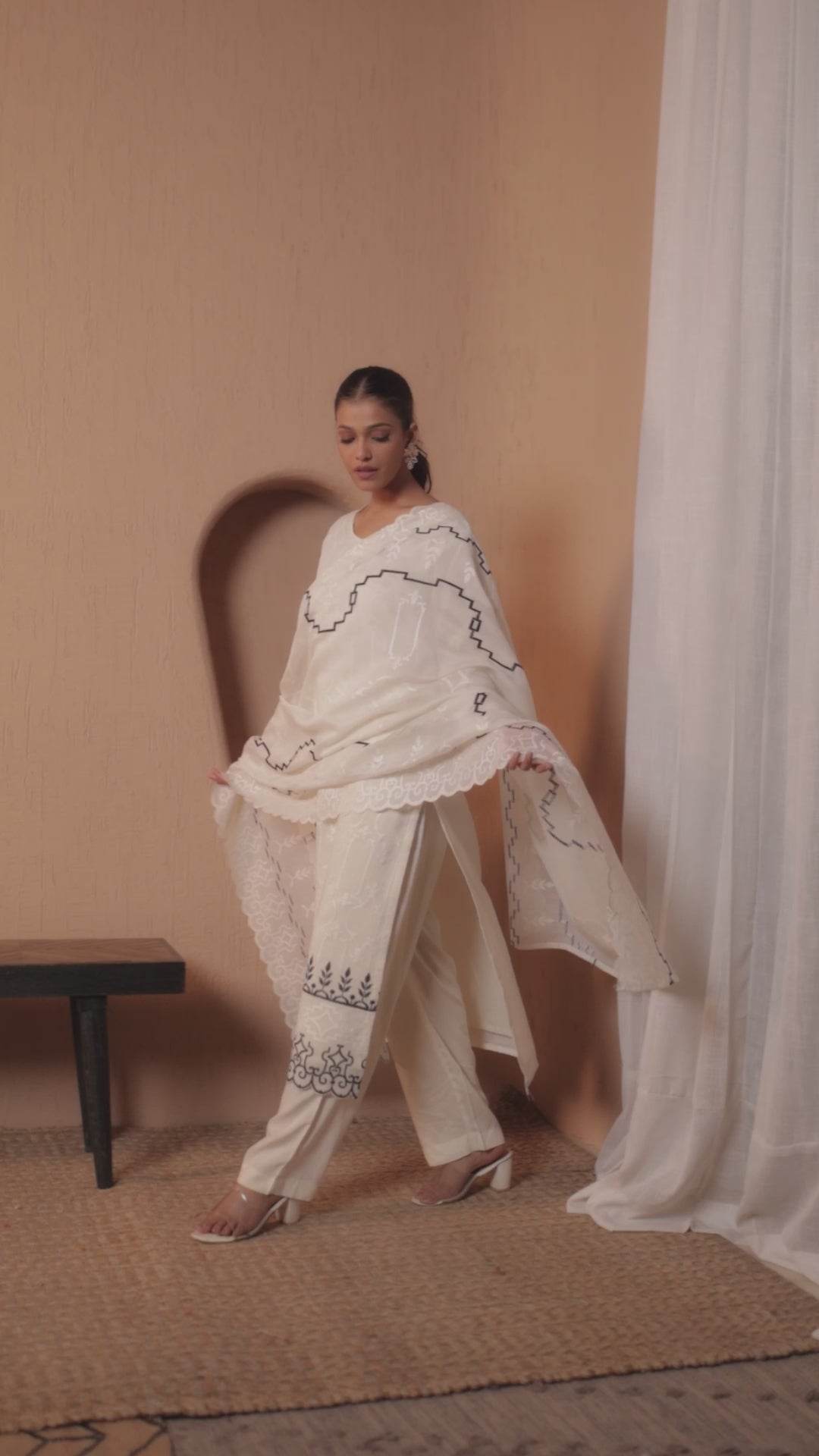 An ode to timeless elegance, Eira is a pure mul chanderi ensemble featuring intricate applique jaal work on a pure mul chanderi shirt, adorned with delicate pearl buttons for a refined touch. The matching pure mul chanderi dupatta showcases applique jaal embroidery, adding structure and sophistication. The pure modal bottom ensures comfort and fluidity, making this piece a perfect choice for festive gatherings, daytime soirees, and celebratory occasions.