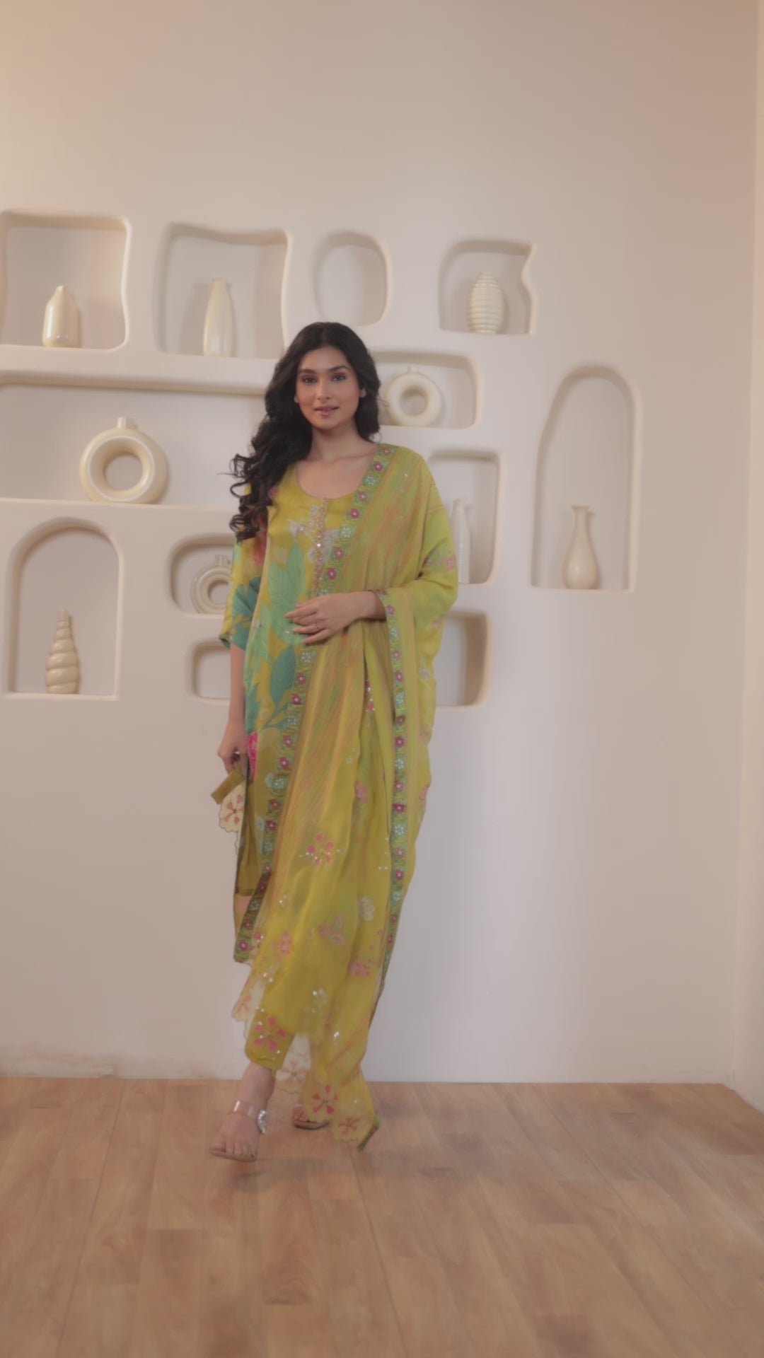 Mehr Pure Organza Satin Printed Kurta Set with Organza Dupatta - Olive Green