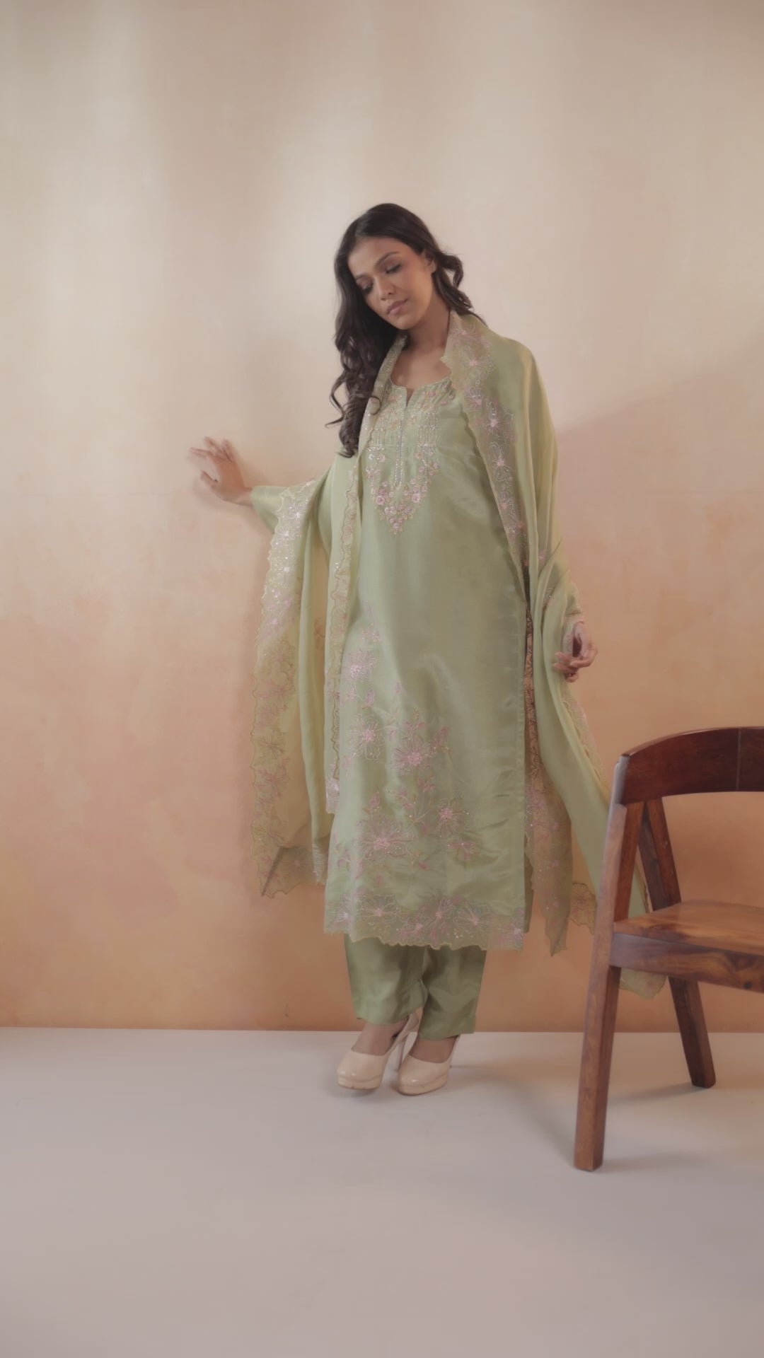 Zayna Tissue Embroidered Kurta Set with Pure Organza Dupatta - Sage Green