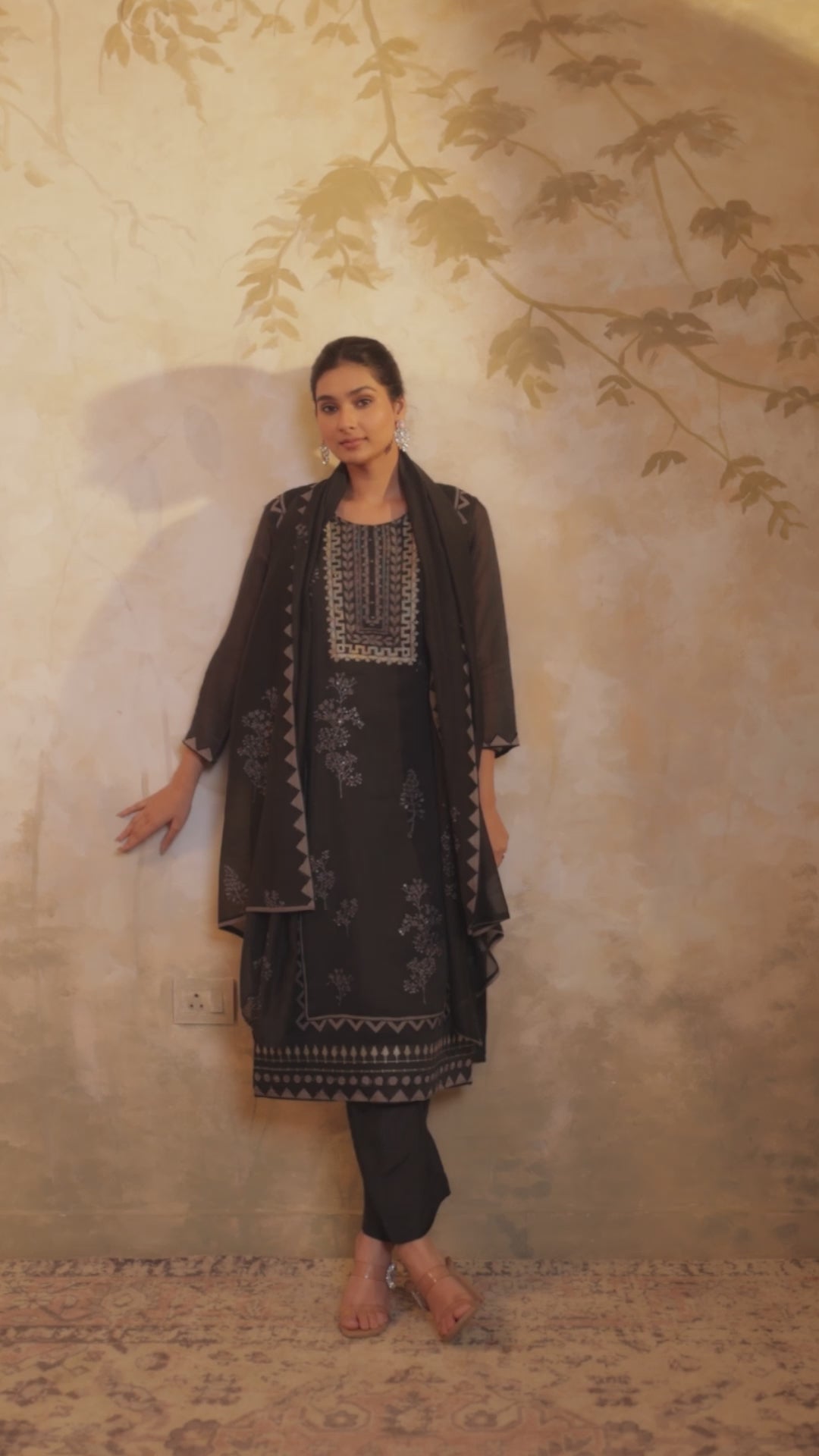 Zayra Pure Mul Chanderi Embroidered Kurta Set with Dupatta - Black