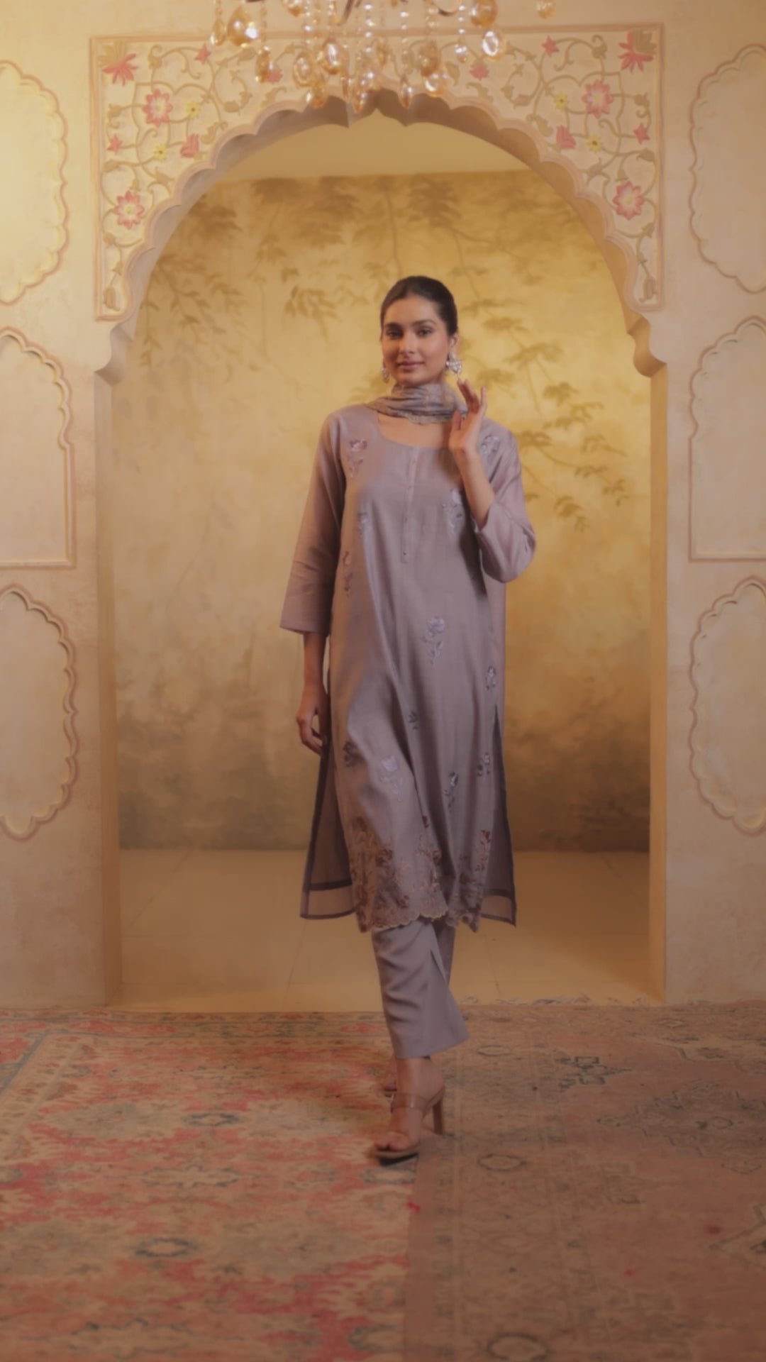 Zyra Pure Mul Chanderi Embroiderd Kurta Set with Dupatta - Mauve Grey
